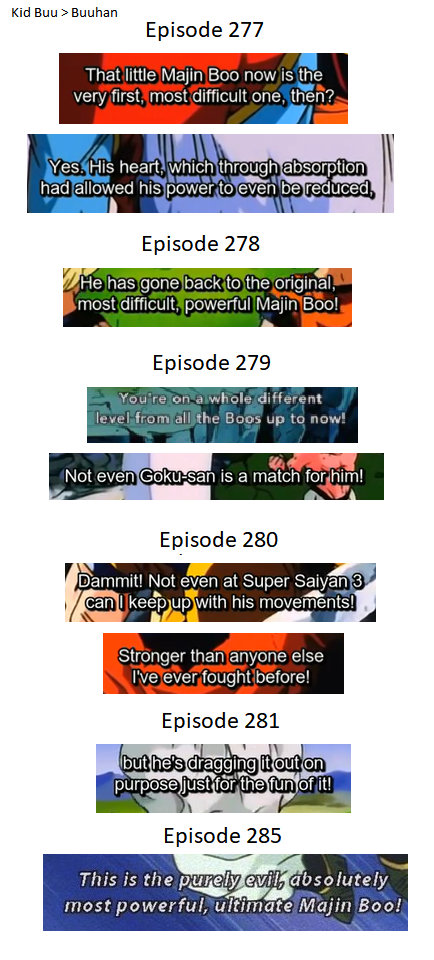 C'est de la pure logique dans le manga Goku supplie Vegeta de fusionner parce qu'il a aucune chance même en SSJ3, par contre contre Kid Buu il certifie qu'il pourrait le "désintégrer" en se donnant à 100%. Même Vegeta dit que Goku est capable de tenir tête à Kid Buu. Quand vous prenez pour exemple Kibito qui dit qu'il a un peu regagner en puissance en redevenant Kid Buu c'est comparé à "Super Buu" pas à Buuhan.