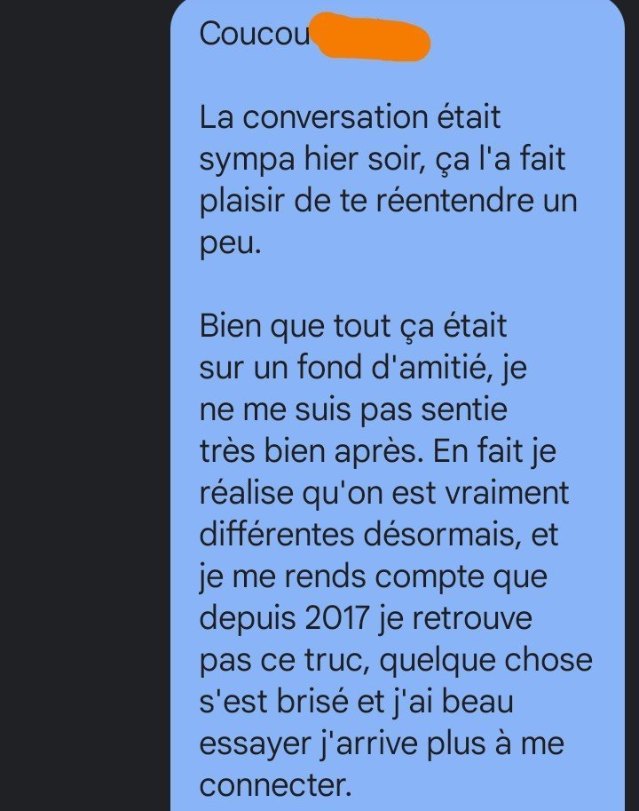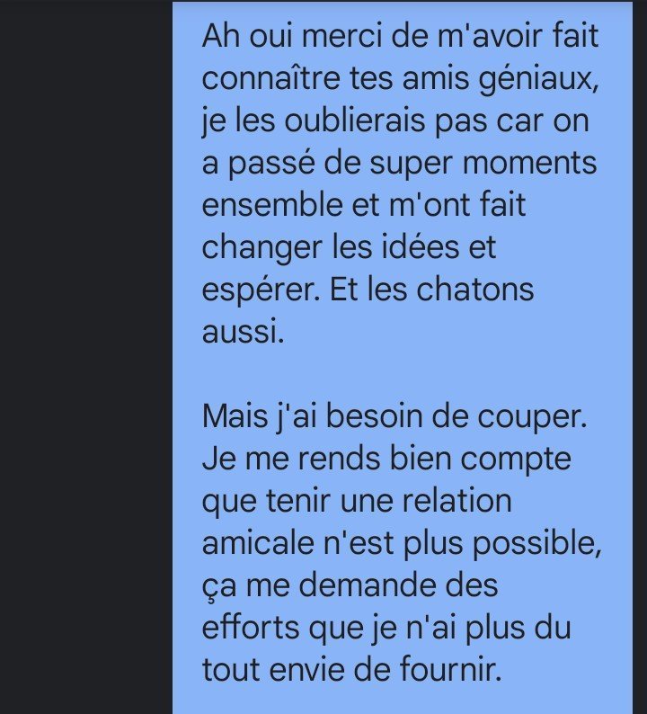 On a eu une discussion houleuse par téléphone hier soir (elle est très anti vax et moi non désormais mais bref), j'ai dit des trucs comme je pourrais pas ne pas avoir de boulot ni de copain, je peux pas vivre sans, j'avoue que je pense que je ne l'ai pas assez écouté, elle m'a confier vouloir se suicider jai pas trop écouté... Je suis nulle en Psychologie...