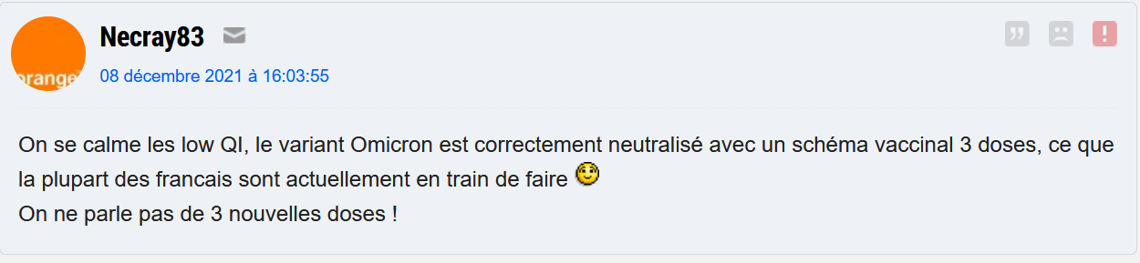 "On se calme les low QI, le variant Omicron est correctement neutralisé avec un schéma vaccinal 3 doses, ce que la plupart des francais sont actuellement en train de faire