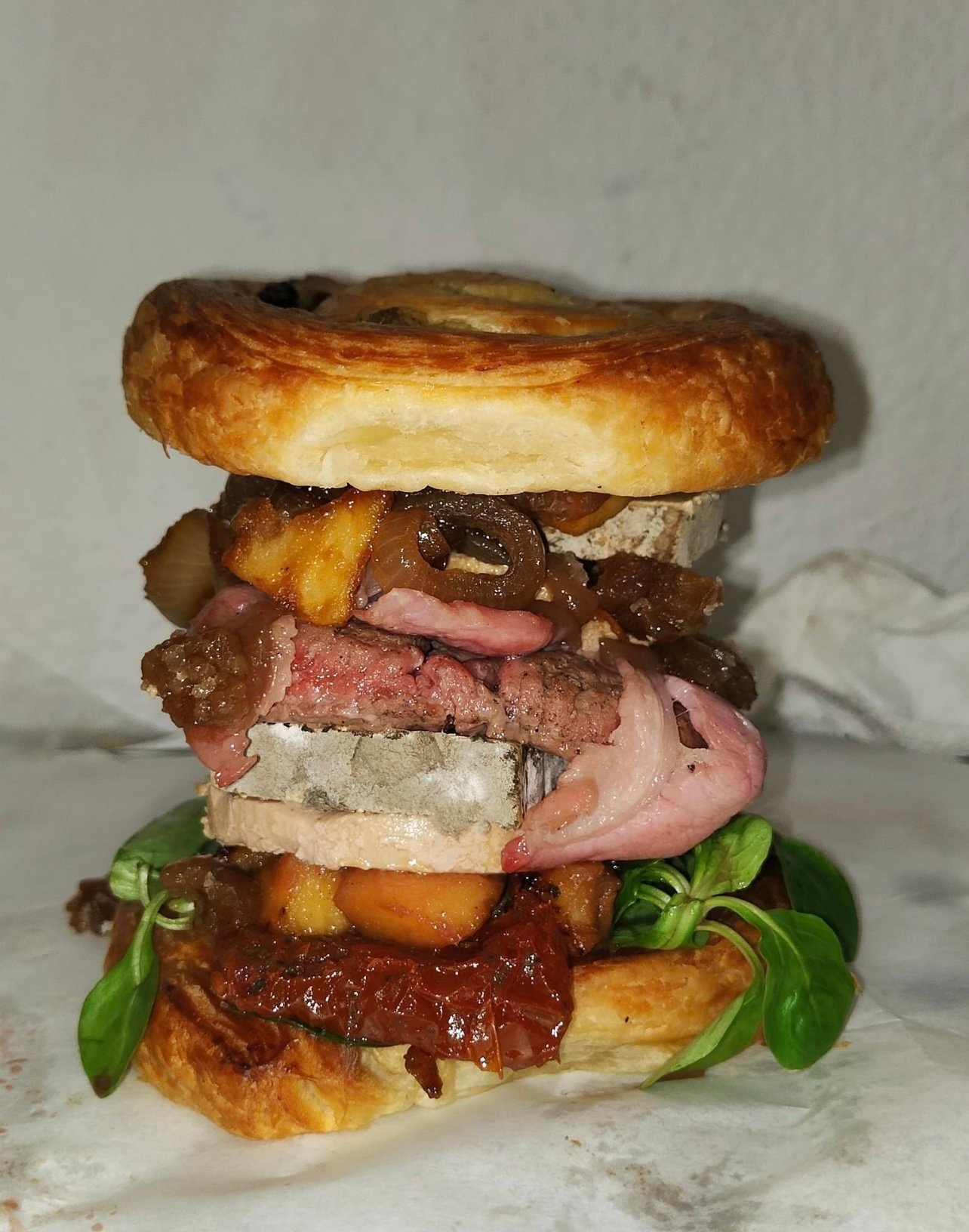 Pains au raisinsTome de BrugesFoie grasOignons caramélisés au muscat BanyulsLard et pommes caramélisées au sirop d'érableViande bovine françaiseCrème de marronMorceaux de marrons GlacésTomate confiteMâche