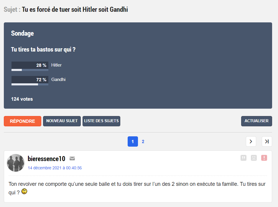 Pour Emma C'est un forum de puceau donc ça je comprend, mais cette haine de Gandhi, terrible... Je comprend pas