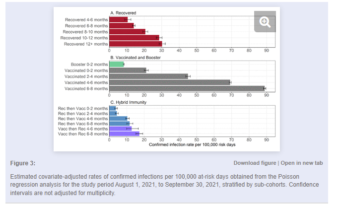 ".. les individus précédemment infectés avec ou sans une dose de vaccination ont une meilleure protection que les individus doublement vaccinés non infectés 3 à 8 mois après le dernier événement conférant l'immunité. Nos données sur les patients hospitalisés Covid-19 atteints d'une maladie grave ont trop peu de cas pour une analyse définitive mais ne semblent pas étayer un rapport récent qui suggère que les individus vaccinés étaient plus protégés que les individus précédemment infectés 3 à 6 mois après l'immunité conférant l'immunité."