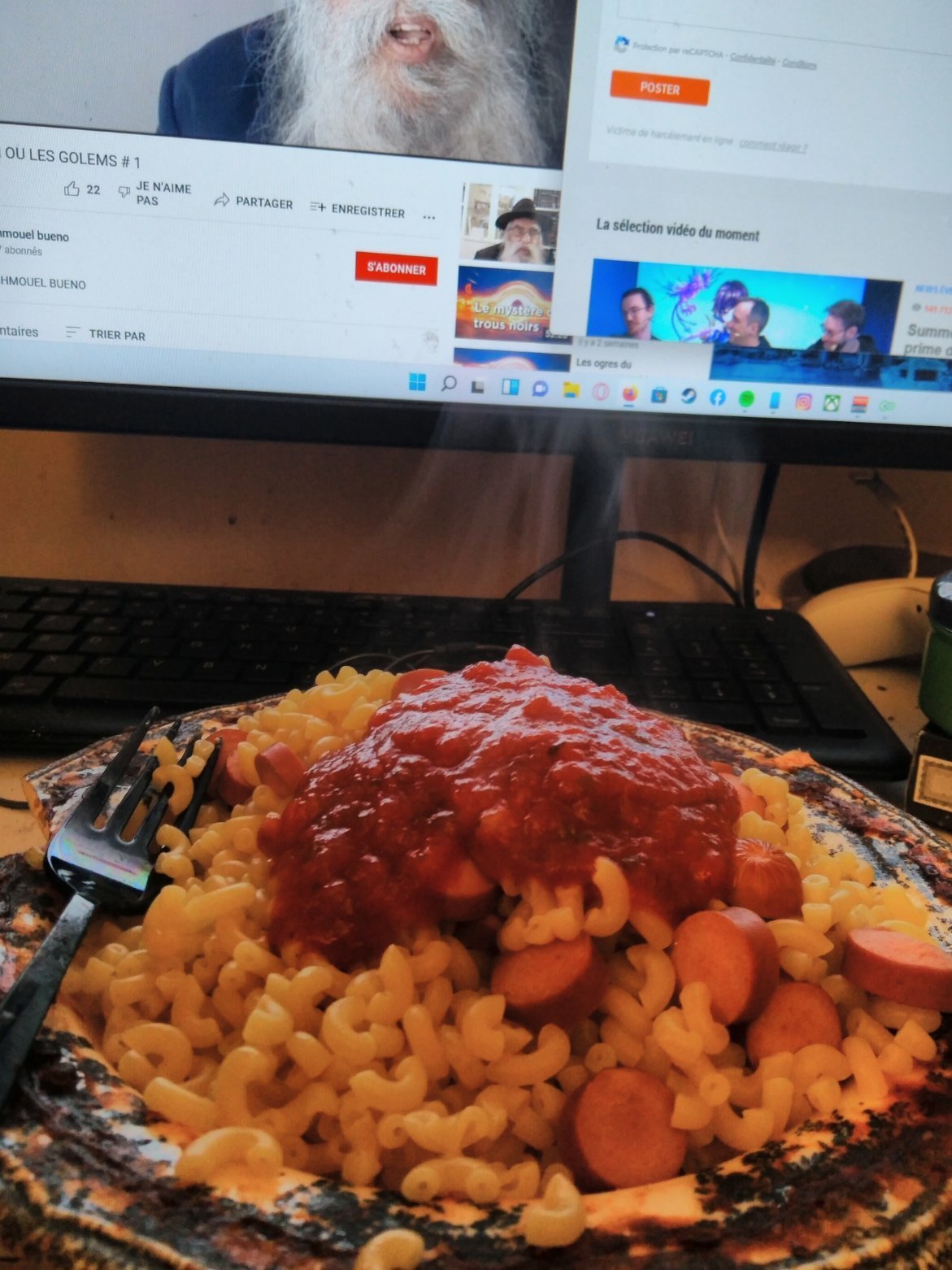 Le 24 décembre 2021 à 23:19:27 : Knacki coquillettes sauce tomate basilic devant une vidéo rabbinique