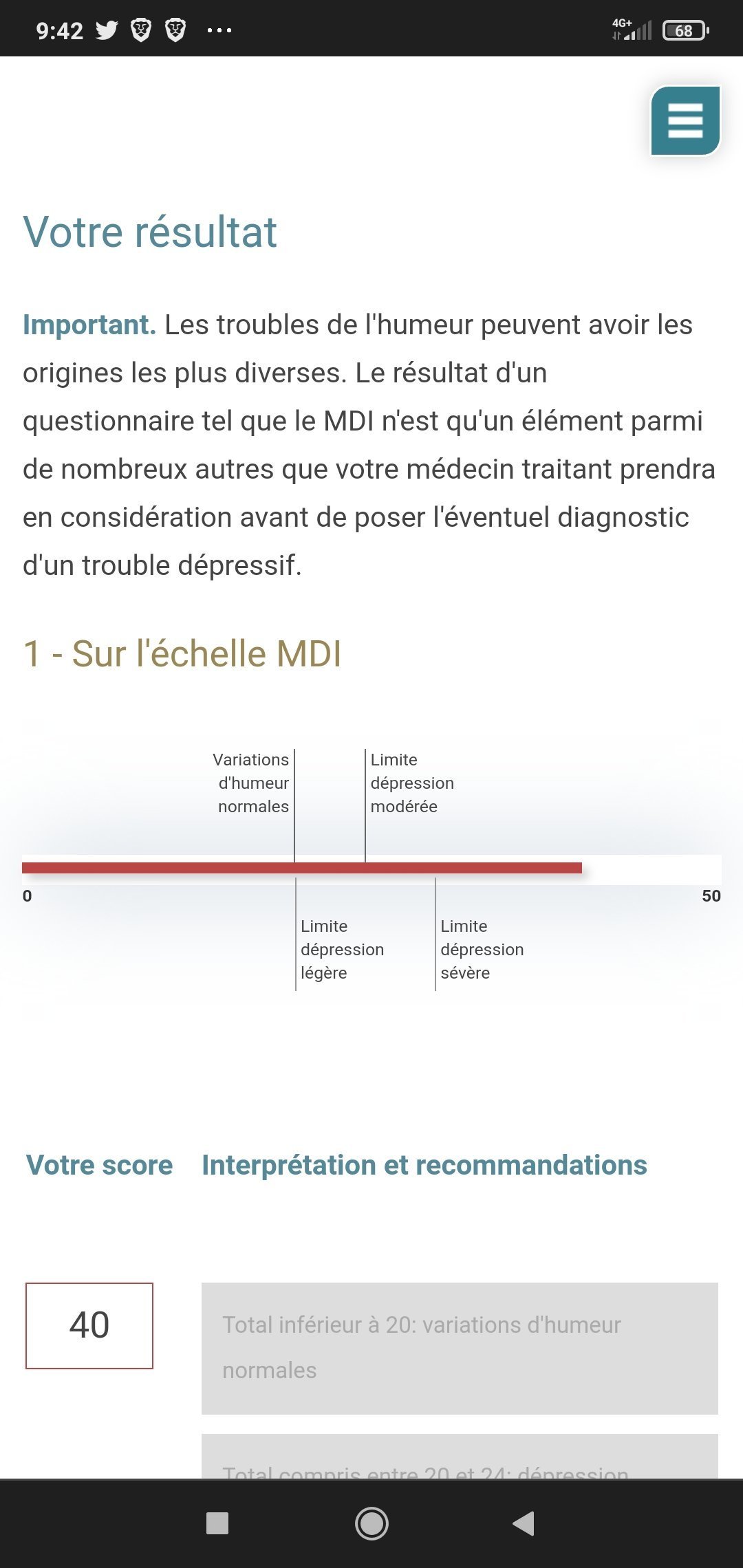 "La version électronique1 de ce questionnaire n'a d'autre vocation que de vous permettre une première auto-évaluation prudente de votre humeur actuelle. Le résultat n'a en aucun cas valeur de diagnostic médical"