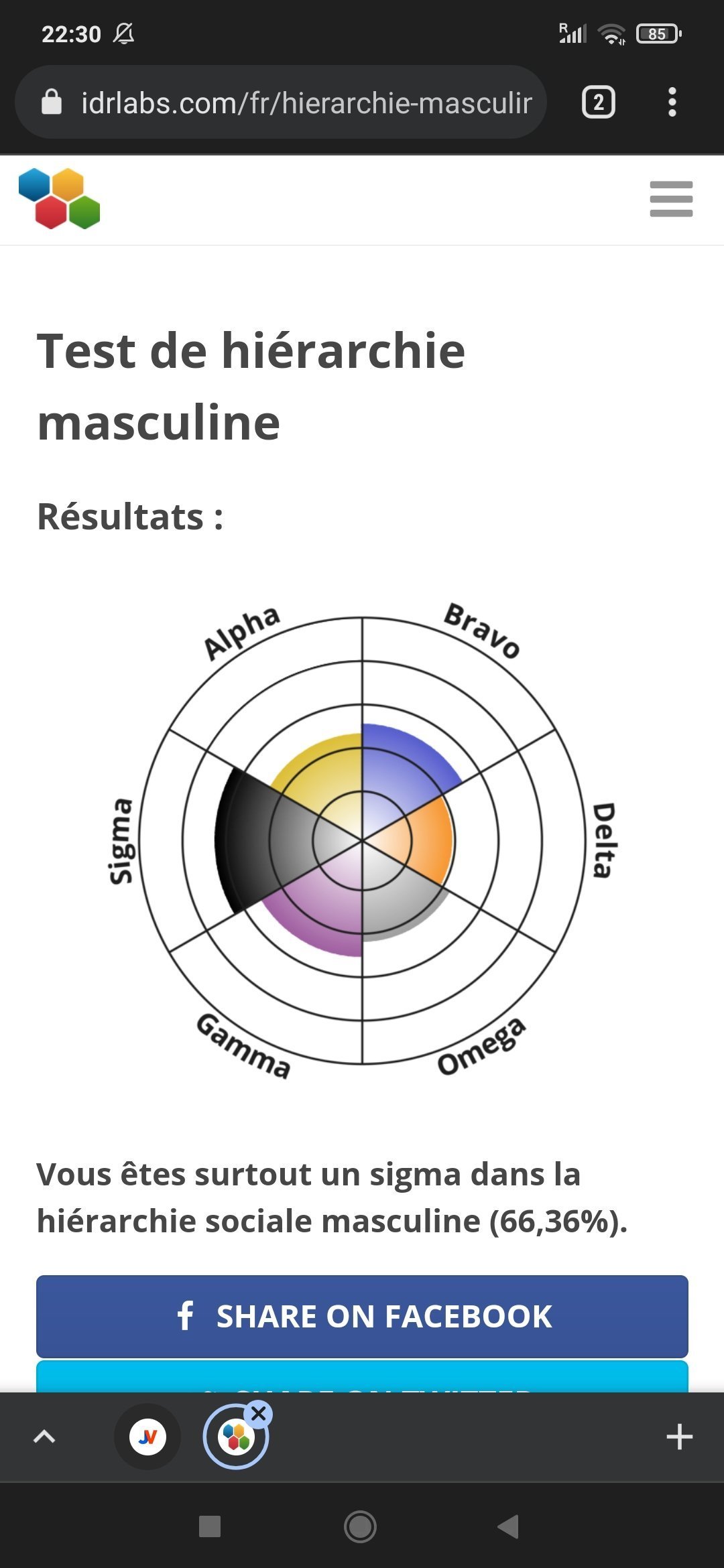 Par contre impossible que sur ce forum de puceaux y'ait autant de sigmas la plupart doivent etre des gammas ou omegasLa plupart ne répond pas honnêtement aux questions, ou alors ils se font de lourdes illusions sur eux-mêmes