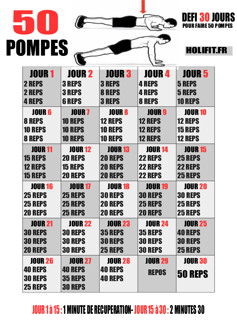 Si c’est beaucoup trop simple pour certains, vous avez le choix d’utiliser ce site https://www.100pompes.com/ pour savoir votre potentiel concernant les pompes.