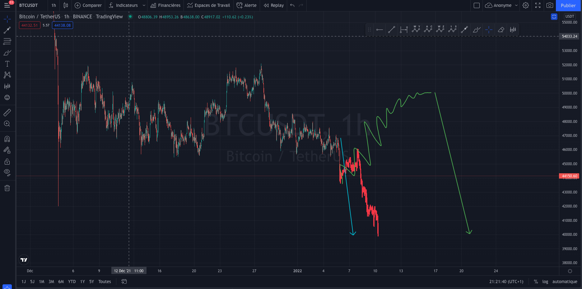 Actuellement on est là, et on attend ça en 1h. Je suis déjà dans la vente pour le scénario bleu. S'il corrige en interne, il donne le scénario rouge, on tente. S'il fait une plus grande correction, scénario vert donc, on ira pour le scénario jaune du 2ème screen.