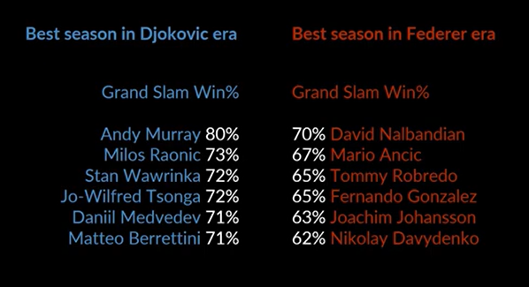 Egalement sur l'ère Djokovic, on a 6 joueurs qui ont un pourcentage de victoires en Grand Chelem supérieur à 70% parmi tous les joueurs qui ont atteint leur apogée pendant l'ère Djokovic : Murray, Raonic, Wawrinka, Tsonga, Medveded et Berrettini. En ce qui concerne l'ère Federer, seul David Nalbandian a 70% de pourcentage de victoires en Grand Chelem parmi tous les joueurs ayant atteint leur apogée pendant l'ère Federer.