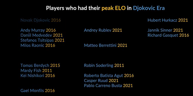 Si l'on exclut Federer et Djokovic de l'équation, ce sont les joueurs qui ont eu le meilleur elo de fin de saison au cours d'une des 4 meilleures saisons de Federer et de Djokovic ( hors 2023 dans le cas Djokovic ). Et le même joueur peut apparaître plusieurs fois. Le seul joueur qui apparaît dans le top 10 est Nadal. Un autre fait est que sur ces 8 saisons, le meilleur elo de fin d'année de Nadal a eu lieu pendant l'ère Djokovic, en 2011, la même année où Djokovic a battu Nadal durant 6 finales de grands tournois. Cela prouve encore une fois que Djokovic a dû affronter un meilleur Nadal et aussi plus souvent que Federer lorsque Djokovic et Federer étaient tous les 2 dans leurs meilleures saisons.