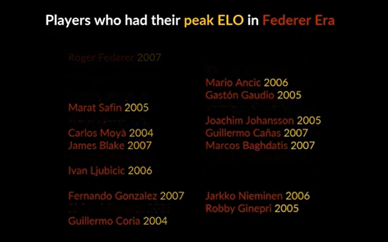 Les joueurs en dehors des 4 meilleures saisons de Djokovic et Federer dans leurs ères respectives ne sont pas inclus. Certains des grands joueurs du passé comme Sampras, McEnroe ne sont pas inclus. Les plus grands rivaux de Federer de son époque sont en rouge et les autres sont en bleu. On peut voir comment les 6 joueurs en rouge se classent parmi les autres. Comme on peut le voir sur cette liste, Djokovic a atteint un prime plus élevé que Nadal, suivi de Federer. Le premier rival de Federer est Nadal et remarquez que Nadal a atteint son sommet ELO en 2013, quelques années après la fin de l'ère Federer. Le suivant est Agassi qui a atteint son prime en 1995, 8 / 9 ans avant le début de l'ère Federer. Même à son meilleur niveau, son elo était inférieur à 3 joueurs que Djokovic a dû affronter à son époque : Nadal, Federer et Murray.