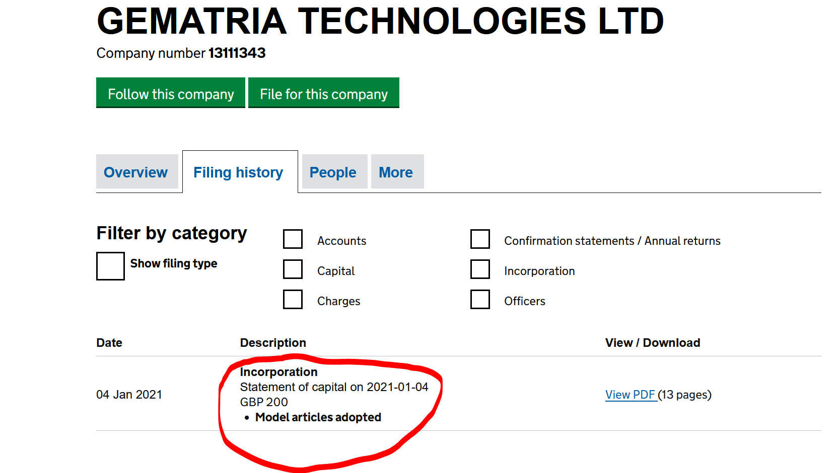 Ca fameuse startup, Gematria TechnologieCapital: 200 GBP soit 250 euro