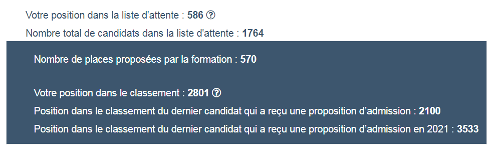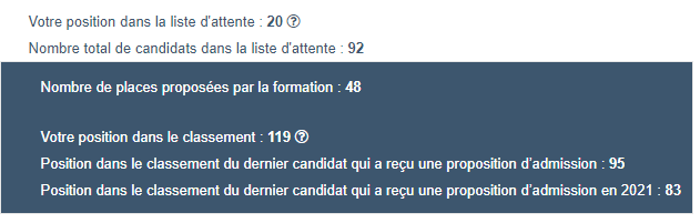 Position dans le classement du dernier candidat qui a reçu une proposition d’admission : 1343 (ce matin, pas en 2021)