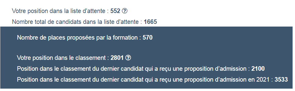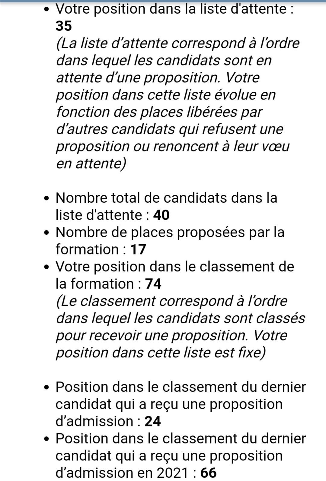 Position dans le classement du dernier candidat qui a reçu une proposition d’admission : 191Pour info vendredi dernier c'était comme ca: