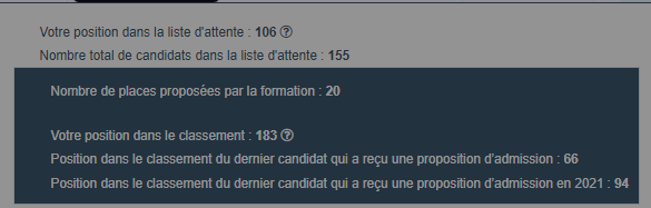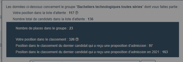 peut-être que les gens au-dessus du classement ont juste accepté un autre voeu définitivement du coup c'est pour ça ^^ on ne sait pas vraiment à quelle personne ils vont réellement arrêter de prendre des gens ^^