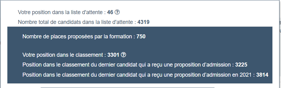 Avant d'en arriver là, vous pouvez vous fier à un autre indicateur : le rang du dernier appelé en 2021. Cela vous permettra de savoir jusqu'où la formation est allée l'année dernière pour remplir ses capacités d'accueil et donc jusqu'où elle pourrait également aller cette année (à moins que le nombre de places proposées cette année soit beaucoup plus important).