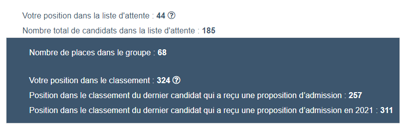 Ce n'est pas pour être méchant mais certains ici ont un meilleur classement que toi (liste d'attente; classement par rapport au dernier admis 2021) et stuck petit à petit voir complètement pour certains/es, tes chances d'être pris sont vraiment nulle comparé a eux khey