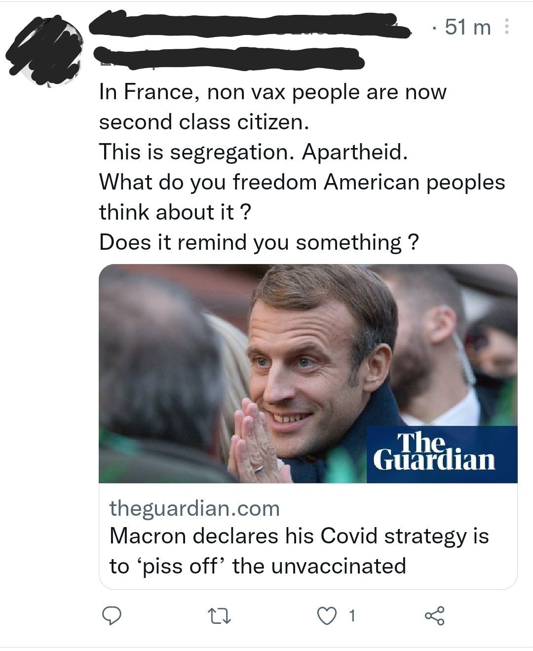 Ça fait depuis les gilets jaunes qu'il est super à cran et fait des sorties assez limites de ce genre. Je pense qu'il ne s'attendait pas à qu'une minorité de gens continuent de lui casser les couilles alors qu'il leur interdit quasi tout s'ils ont pas le famoso schéma vaccinal.