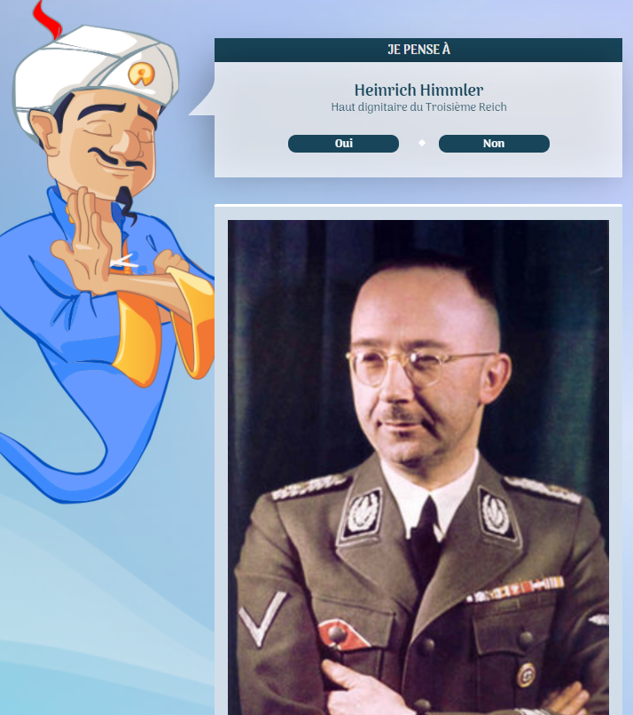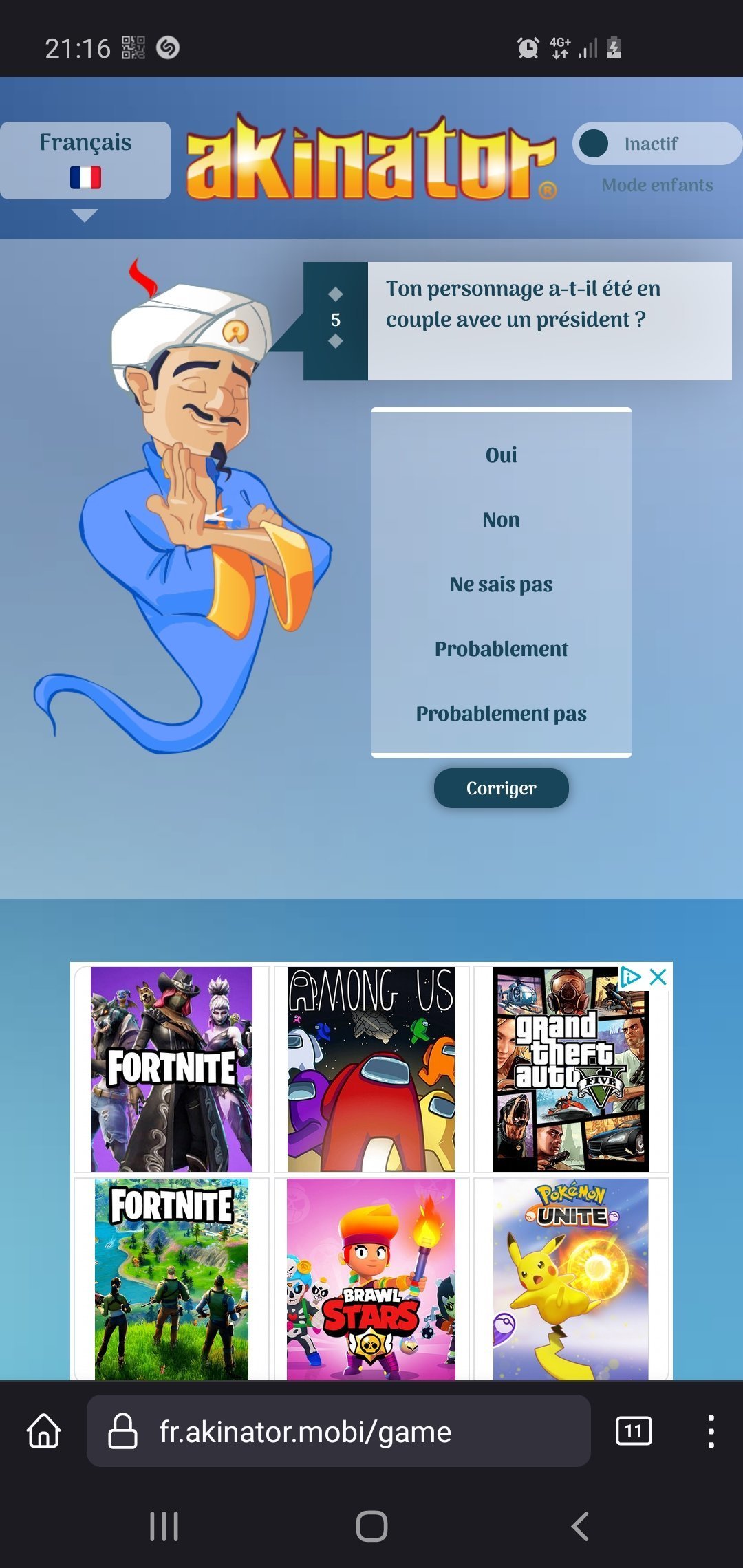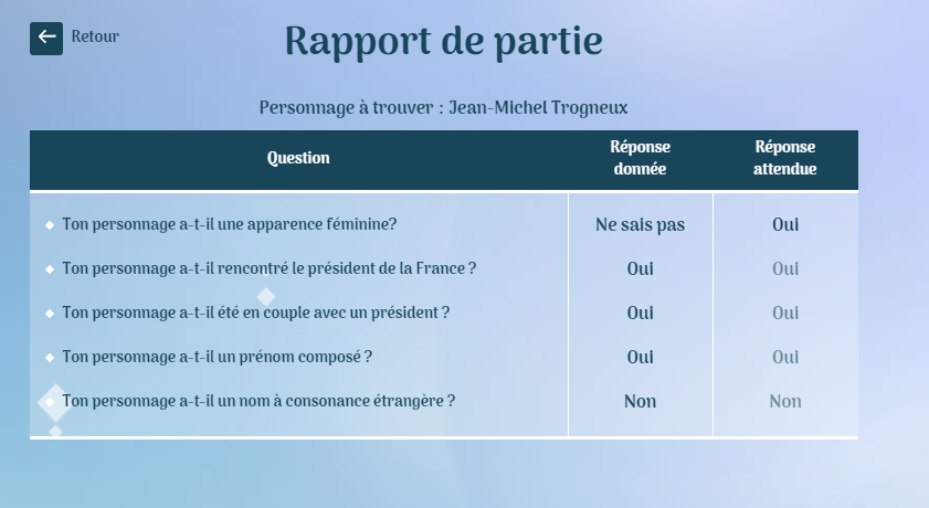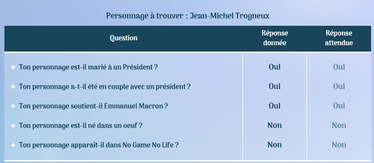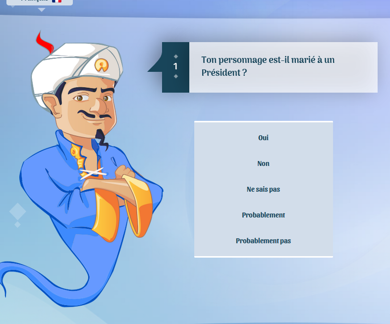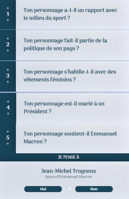Et la premiere question qu'il me pose c'est si le personnage porte des vetements feminins, la deuxieme si la personne a rencontré le président