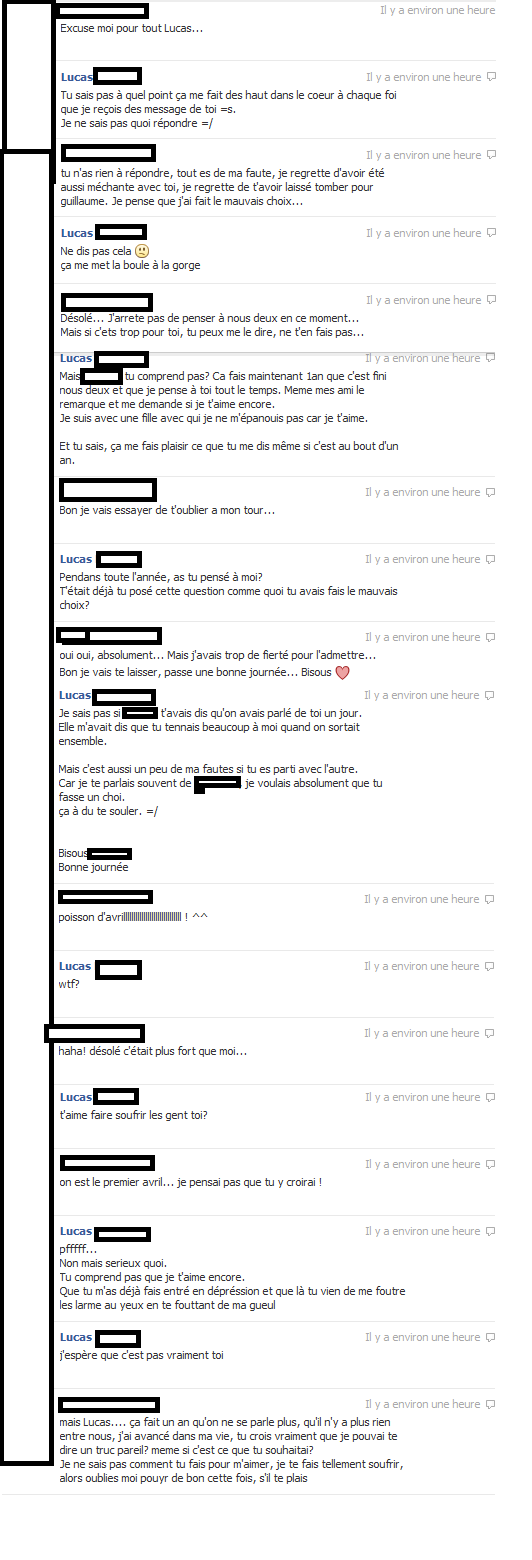 - Je sais pas si ta meilleure amie te l'a dit qu'on avait parlé de toi un jour. Elle m'avait dit que tu tennais beaucoup à moi quand on sortait ensemble. Mais c'est aussi un peu de ma fautes si tu es parti avec l'autre. Car je te parlais souvent de lui, Je voulais absolument que tu fasse un choix. ça a du te souler =/ Bisous Lea Bonne journée
