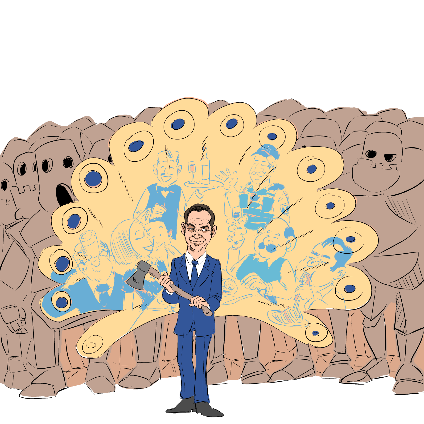 Olivier Véran avec une queue de paon dont le motif représente un rassemblement convivial au restaurant. La queue bloque la vue des golems, qui se trouvent derrière Véran. Ce dernier tient une hache, qu'il cache contre lui en regardant sournoisement en arrière.![]()