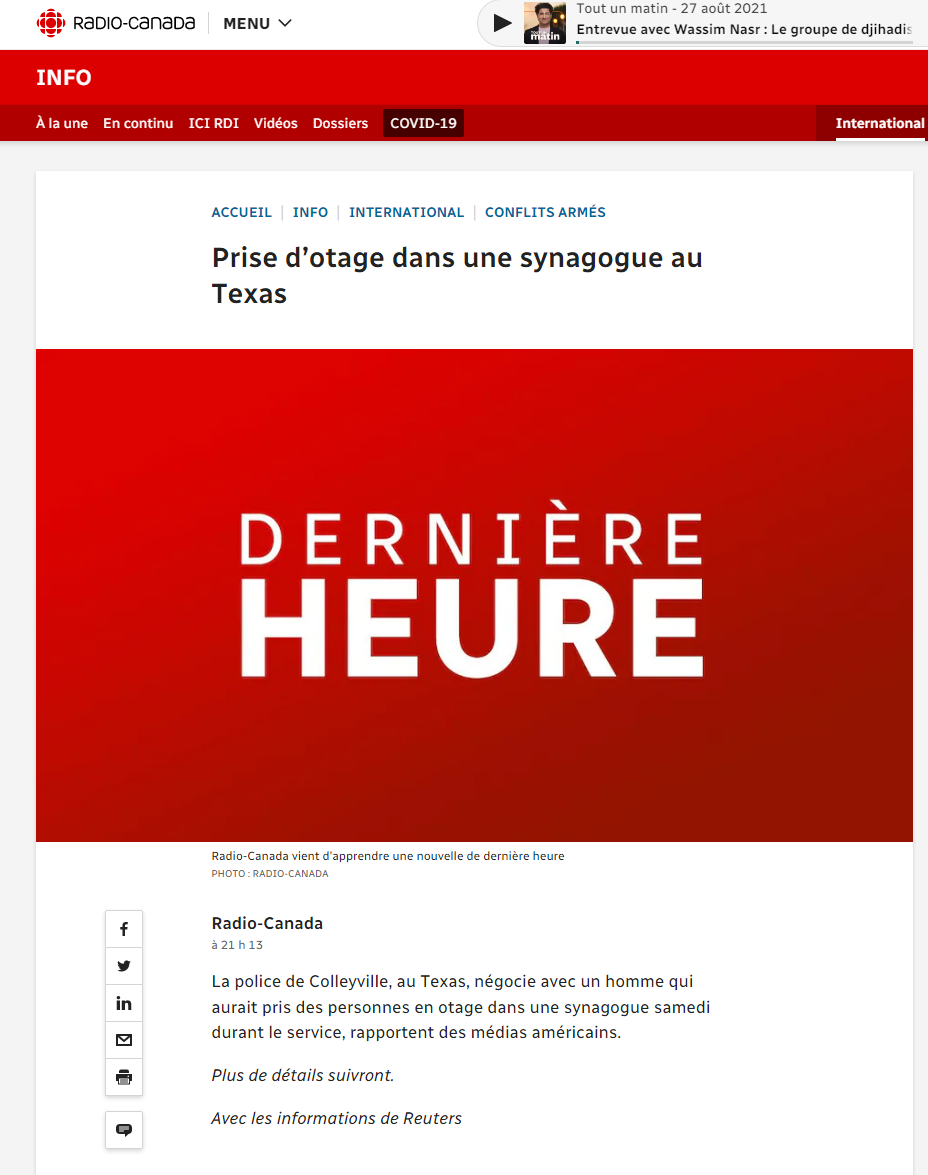 Le 15 janvier 2022 à 21:48:18 : Selon ABC News : "La sœur du suspect est un terroriste connu qui est incarcéré à la base aérienne de Carswell, près de Fort Worth, et il exige la libération de la sœur, selon la source. Le preneur d'otages prétend avoir des bombes. Dreuz
