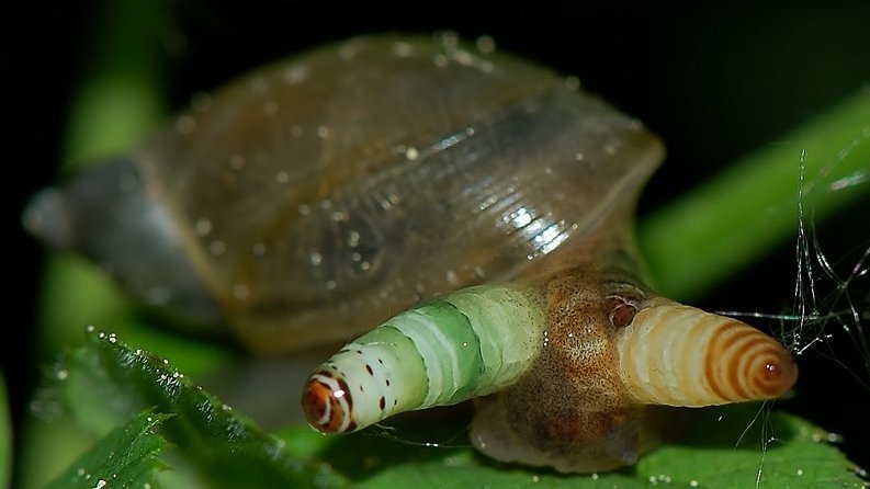 Locataire qui, ni une, ni deux, ne trouve pas de meilleur endroit pour s'installer que dans les yeux, et transforment ainsi le gasteropode en boule à disco.