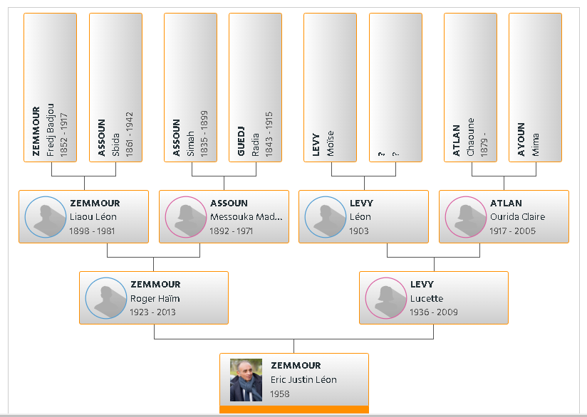 si on prend le premier de ses ancêtres à être devenu français grâce au décret Crémieux donc en 1870 et on le compare à lui, rien a changé, le z est communautaire et endogame, tous ses ancêtres, maternels et paternels se mariaient entre eux, il n y a aucun français de souche dans son arbre généalogique