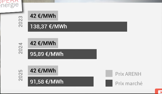 possibilité pour les concurrents d’acheter de l’électricité à EDF au prix de production dans la limite de 100 Twh/an (soit 25% de la production EDF) au prix fixe 42€/Mwh.