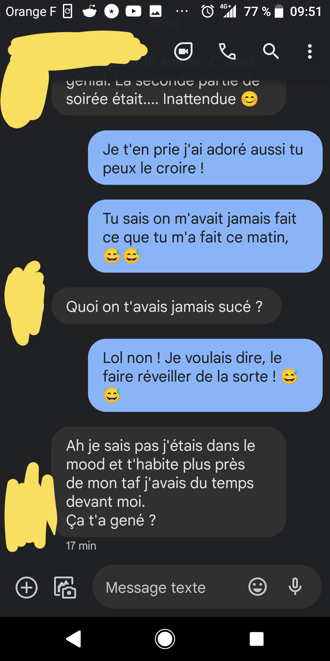 Une heure avant le réveil, je me fais réveiller par une pipe incroyable, c'est irréel jamais j'ai eu le droit à ça ! ! on remet un troisième round aux petites lueurs du jour, puis elle se prépare et moi aussi.