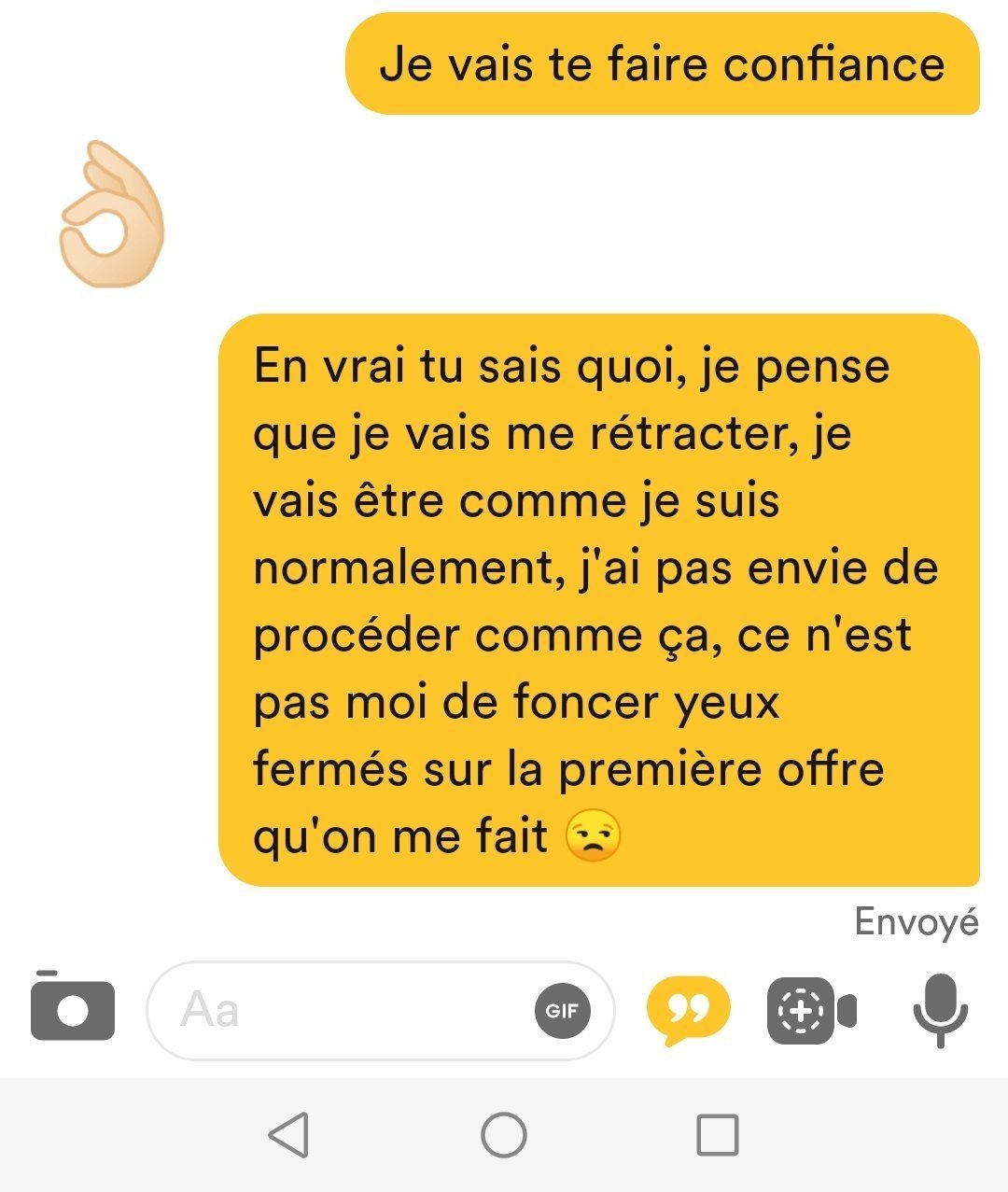 -a nouveau une accélération de 10g (elle voulait un message audio pour répondre aux siens sans doute pour confirmé que j'avais pas une voix et un ton de mec chelou, j'ai donc effacé ses doutes), elle me fait donc comprendre qu'elle veut pas juste boire un coup et que si il y a un bon feeling elle aimerait aller chez moi après
