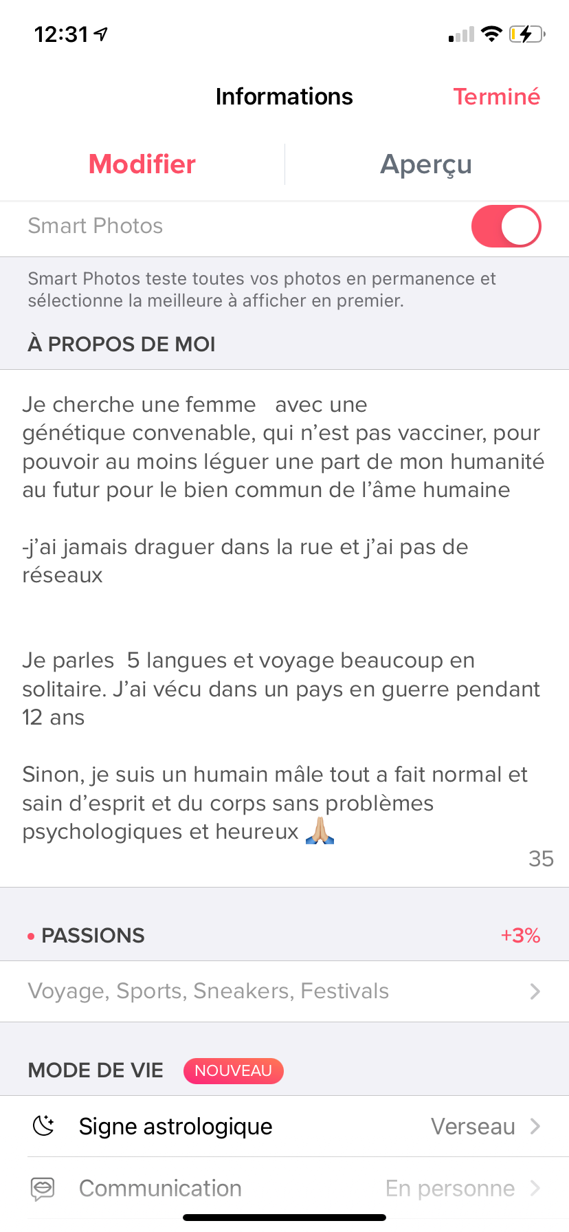 Voilà j’ai créé tinder ya 1 semaine j’ai reçu 74 j’aimes 19 matchs, mais beaucoup de russes et de meufs loin
