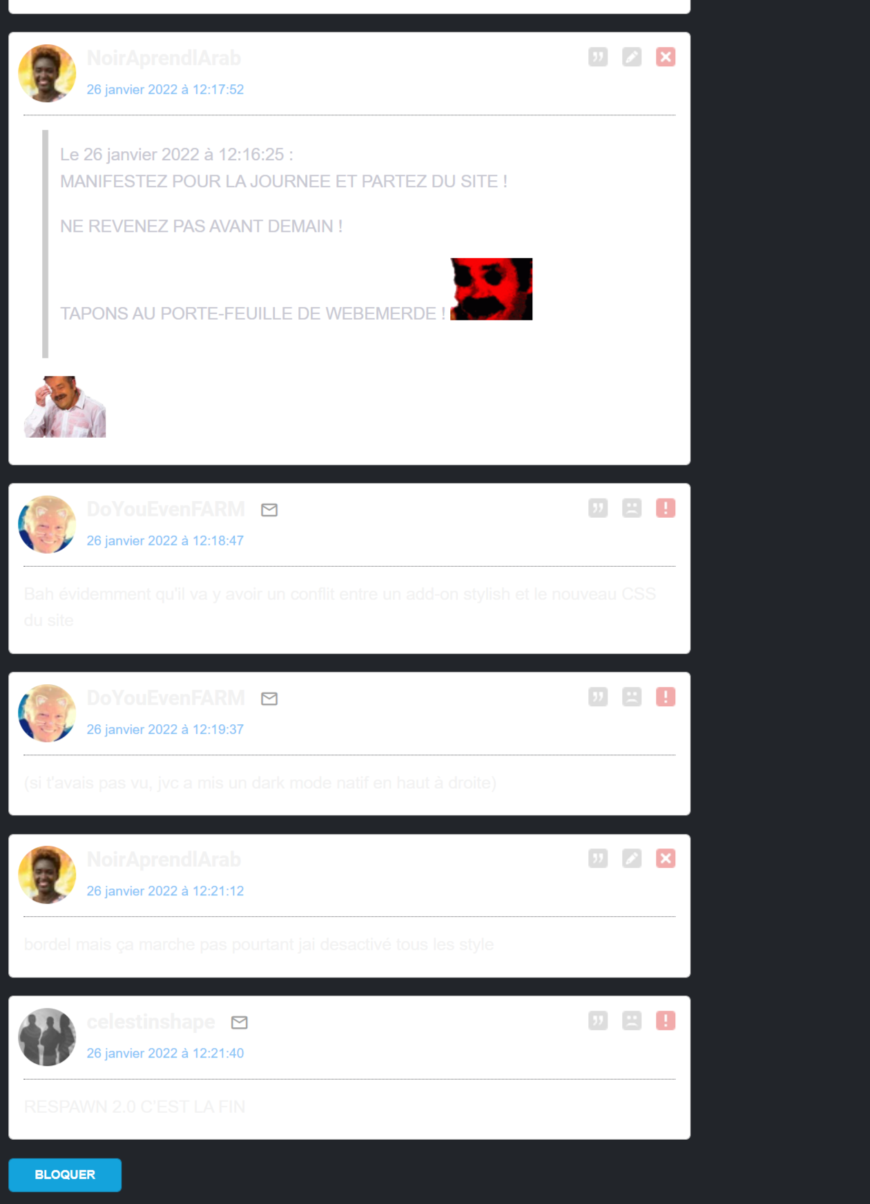 Le 26 janvier 2022 à 12:16:25 :MANIFESTEZ POUR LA JOURNEE ET PARTEZ DU SITE !NE REVENEZ PAS AVANT DEMAIN !TAPONS AU PORTE-FEUILLE DE WEBEMERDE !