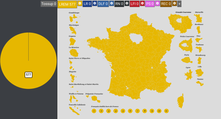 En vrai il y a moyen que Sarko-bis parvienne à récupérer un petit nombre de conscriptions si il atteint les 51% aux présidentielles, ce serait trop gros qu'il puisse avoir un vote assez disparate pour n'en remporter aucune. Mais ce ne sera juste jamais assez face aux victoires ripoublicaines.