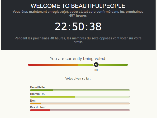 un site de rencontre pour les gens beaux, tu postes ta photo et au bout de 48h soit t'es accepté soit t'es rejeté, en dépit de la vieille cageole
