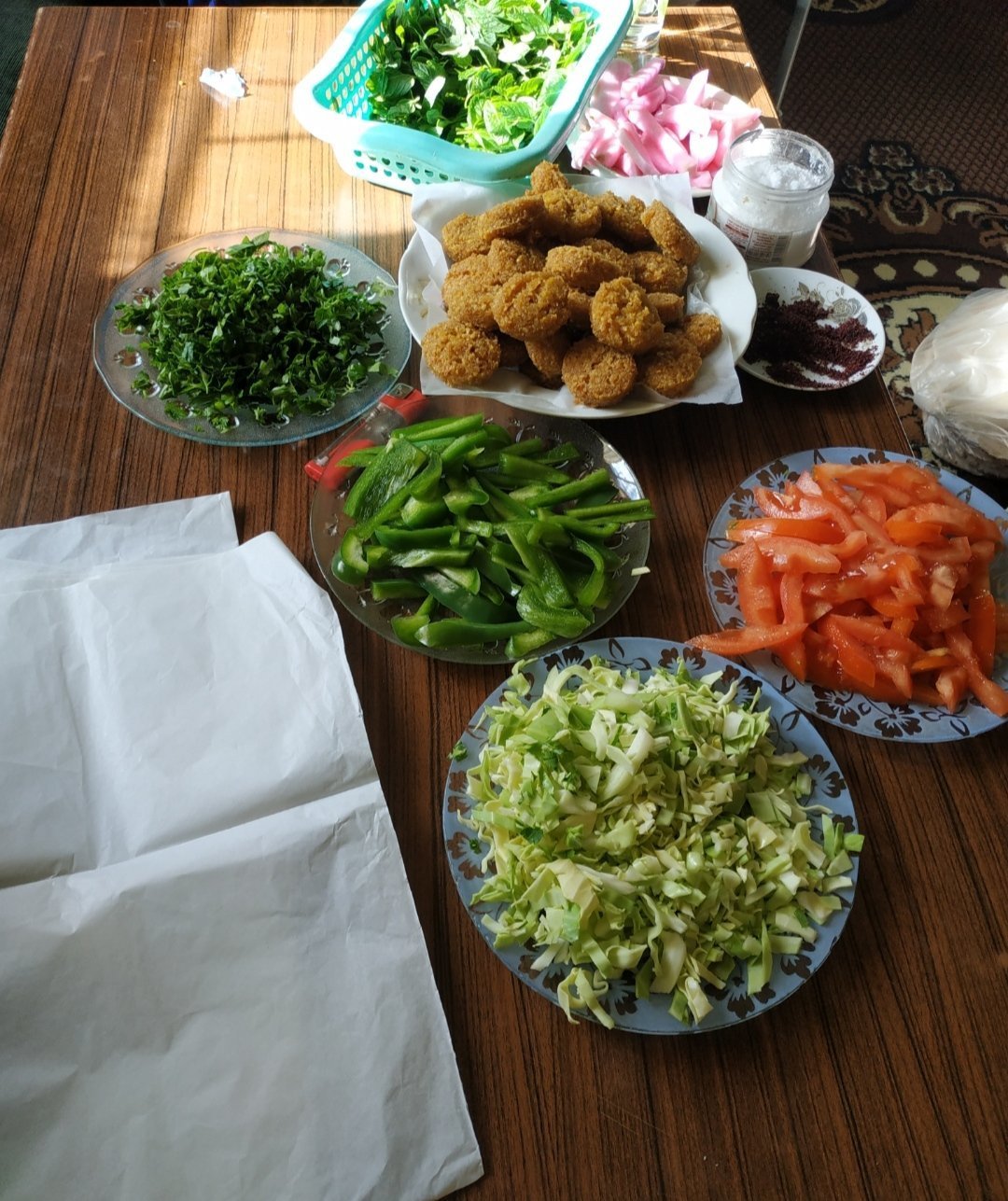 Falafel, persil, menthe, tomates, poivrons, chou, navets marinés, sumac