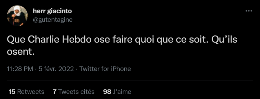 En même temps, ça amuse qui Charlie Hebdo, le journal pue la merde, l'humour est merdique de mauvais goût, si eux postent ce qu'ils veulent laisse moi répondre à ton journal quasi saint qu'il est totalement merdique.Même avant de se prendre l'attentat personne n'aimait et calculait ce torchon