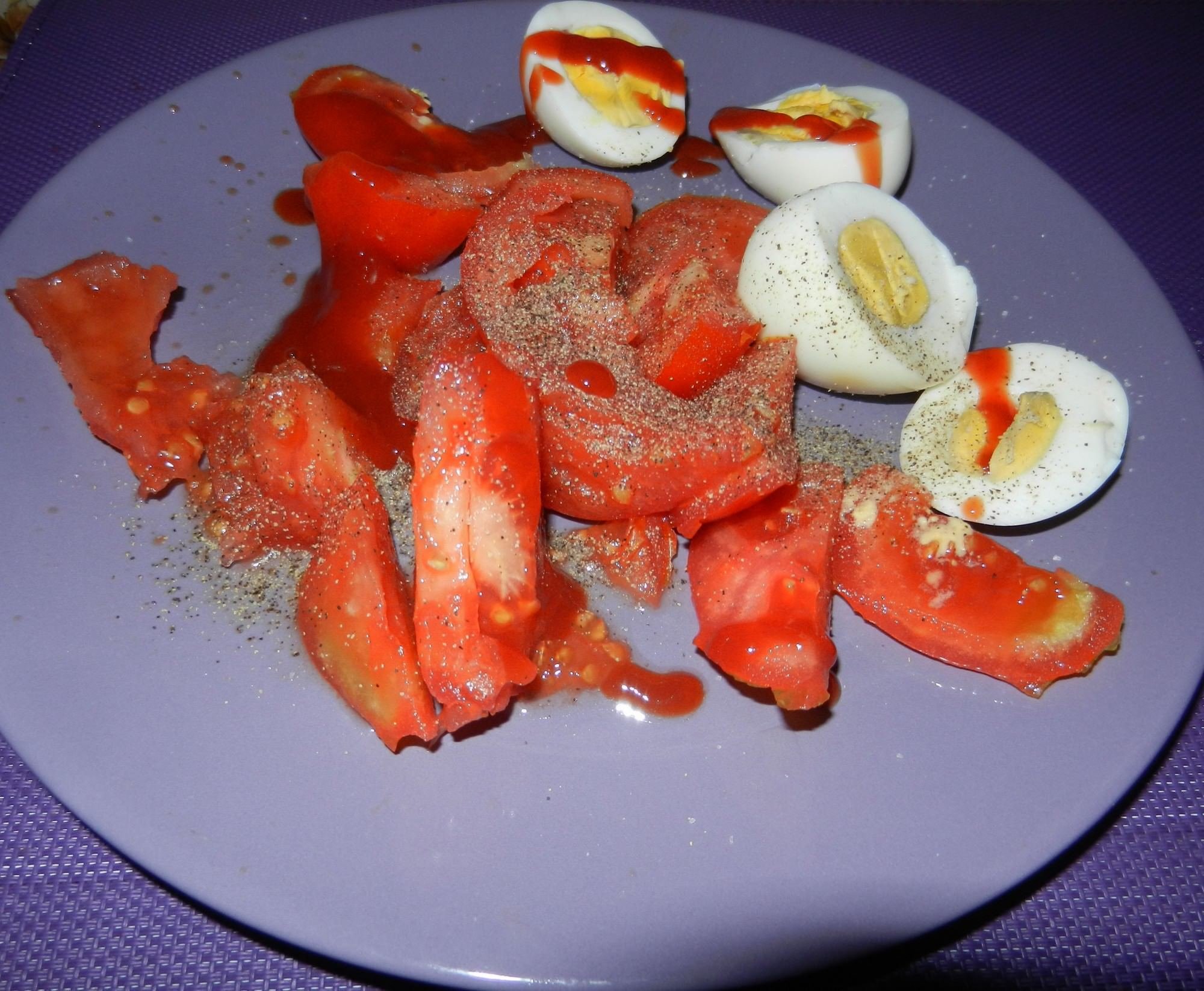 Entrée : Balade printaniÚre, tomates, oeufent et ketchoupent pour donner du peps