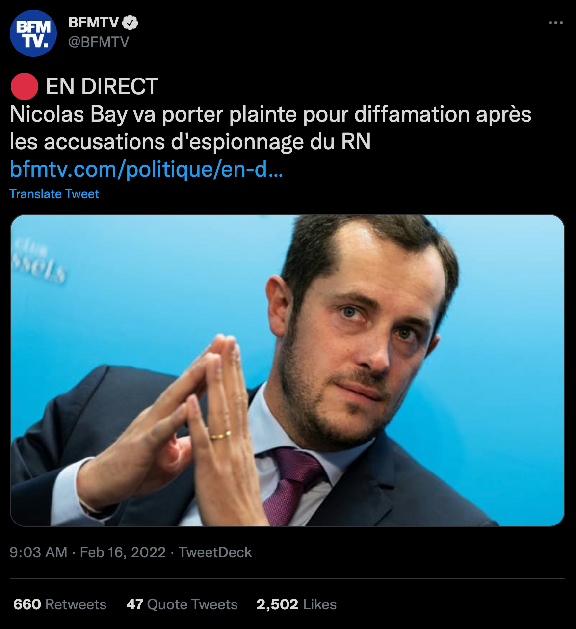 Le 16 février 2022 à 23:50:23 : Le plus ridicule c'est Nicolas Bay dans l'histoire. Pourquoi rester dans un parti que tu comptes trahir dans les semaines qui suivent ?