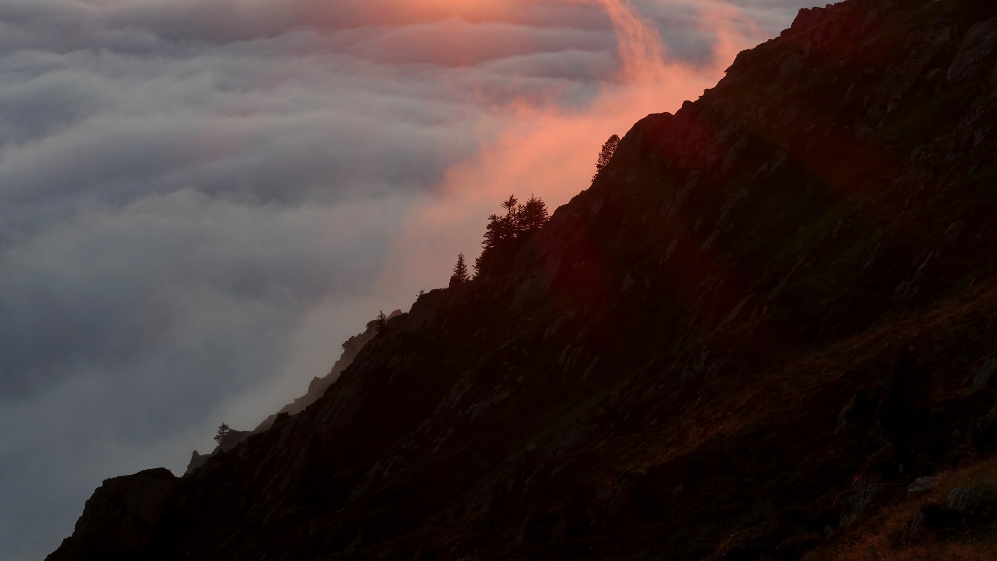 A 20h30, une bergère débarque et nous dit qu'on a dépassé la cabane de 2-3km. Elle nous indique une autre cabane hors sentier, à 800 mètres seulement. On assiste alors à un coucher de soleil merveilleux au dessus de la mer de nuage, puis on allume un feu dans la cabane et on joue aux cartes en bouffant des bonbons jusqu'à minuit