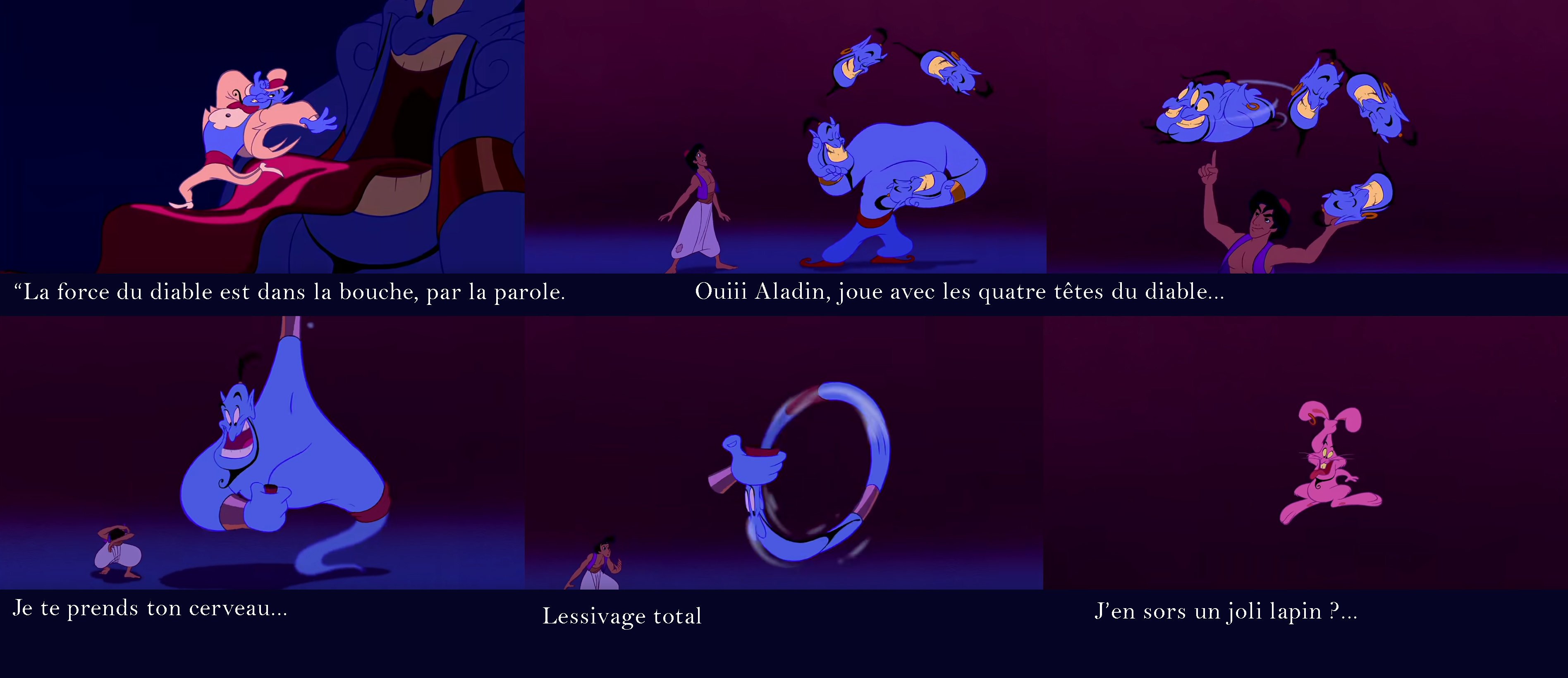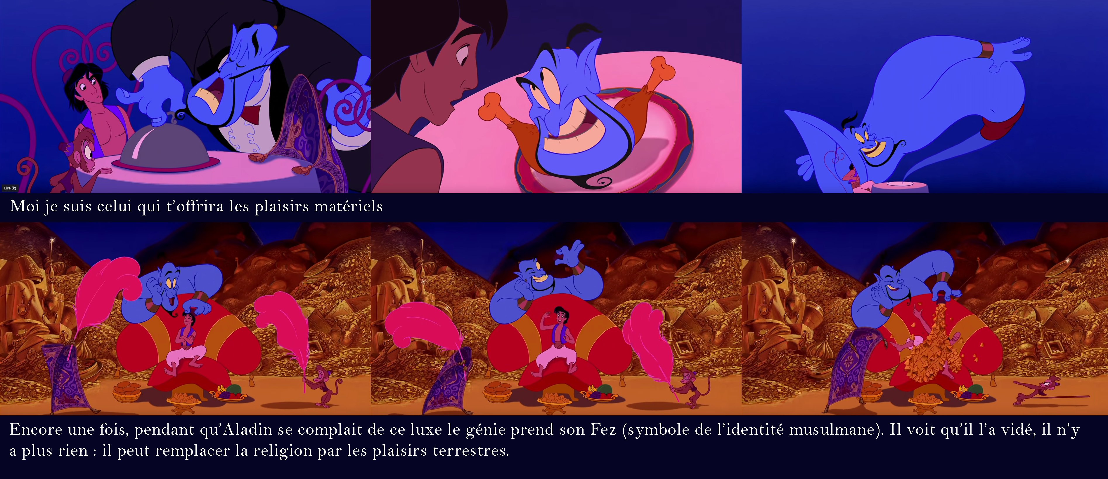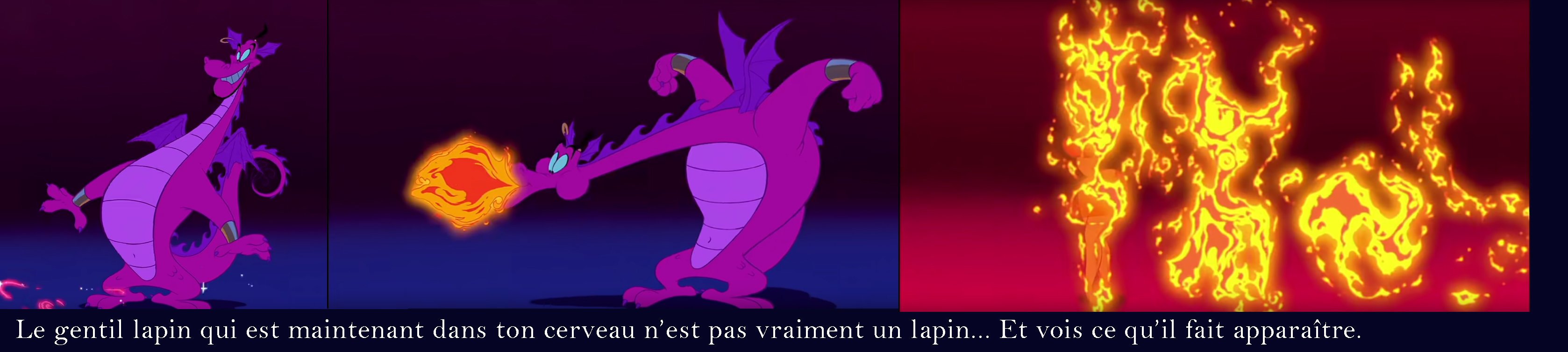 Cette transformation est symbolique : le gentil génie est entré dans la tête d'Aladdin (son chapeau) comme un gentil lapin... mais en vérité il prend sa vraie forme : c'est un dragon qui fait maintenant naître des flammes des désirs lubriques.