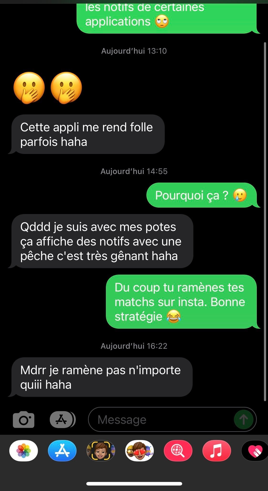 J’ai match une meuf sur tinder, rapidement elle m’a dit qu’elle y allait jamais pcq elle avait coupé les notifs, donc elle m’a filé son 06