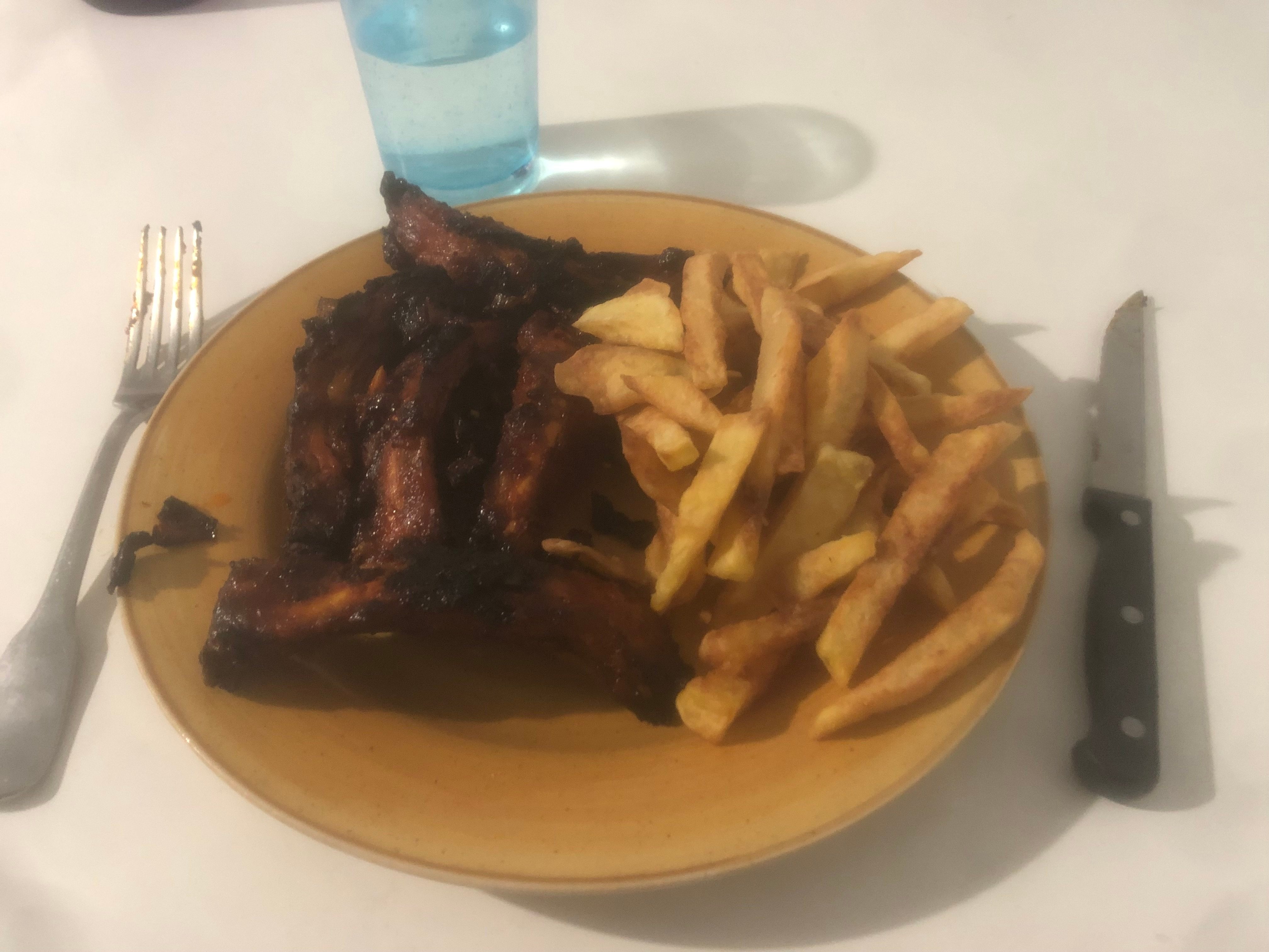 Bonsoir , mes chers kheys. Je me suis préparé un délicieux plat:Travers de porcs marinés à la sauce barbecue accompagné de frites maisons.Voici la photo: