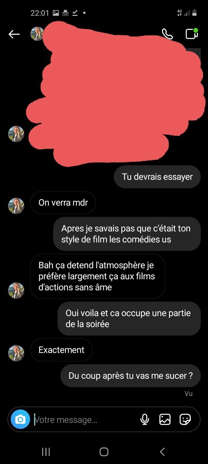 En gros c'est une fille de ma promo en DUT TC avec qui je suis tres proche. J'ai porté mes couilles et je lai invité chez moi demain soir on va regarder des films. Et j'ai voulu sexualiser par message