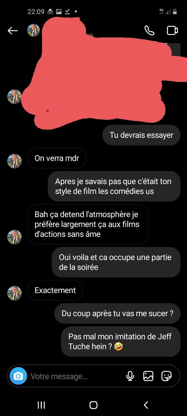En gros c'est une fille de ma promo en DUT TC avec qui je suis tres proche. J'ai porté mes couilles et je lai invité chez moi demain soir on va regarder des films. Et j'ai voulu sexualiser par message