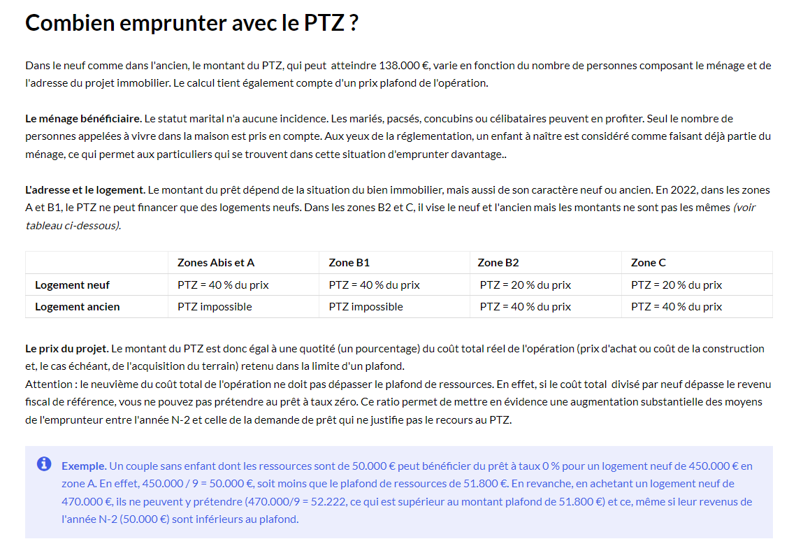 Le PTZ ou prêt à taux 0 %, c'est une aide financière qui facilite l'accession à la propriété des ménages à revenus modestes et moyens. Ce crédit gratuit (le bénéficiaire ne paie pas d'intérêts sur les sommes octroyées) permet l'acquisition d'un logement neuf ou d'un logement ancien (sous conditions de travaux) partout en France. Il a été souvent réaménagé depuis sa création en 1995. Mais il a toujours été conservé par les gouvernements successifs. Il reste valable en 2022, dans les mêmes conditions qu'en 2021. Un temps menacé, le PTZ reste possible en 2022 en zone rurale pour l'achat d'un logement neuf.