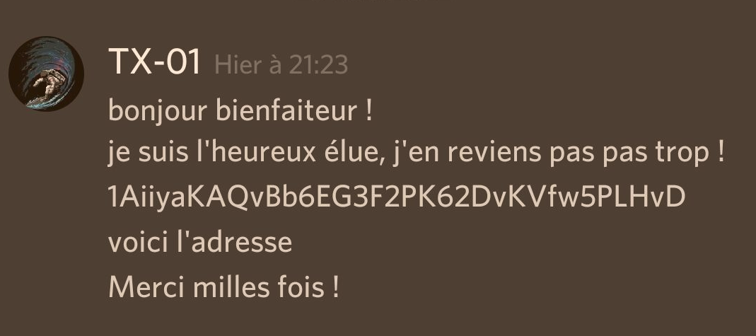 L'admin reconnu par tous les anciens du forum finance, Ozenne, fait régulièrement dons de giveaway btc après avoir take profit aux nombreux top pendant que les animaux achetaient