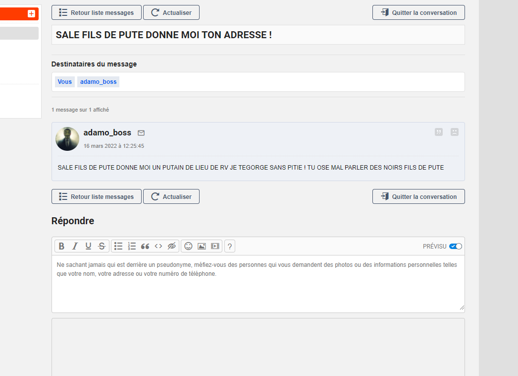 [12:22:51] <unlimited_DDB> Ecoute mon petit pote. Que les choses soient claires. Tu n'es pas intouchable, contrairement à ce que tu crois. On sait que tu postes depuis Effretikon en Suisse, dans la région de Zurich. On a tous tes coordonnées postales. Donc je te conseille d´arrêter de faire le malin si tu ne veux pas devoir expliquer à tes parents pourquoi ils doivent aller purger une peine pour payer tes anneries.