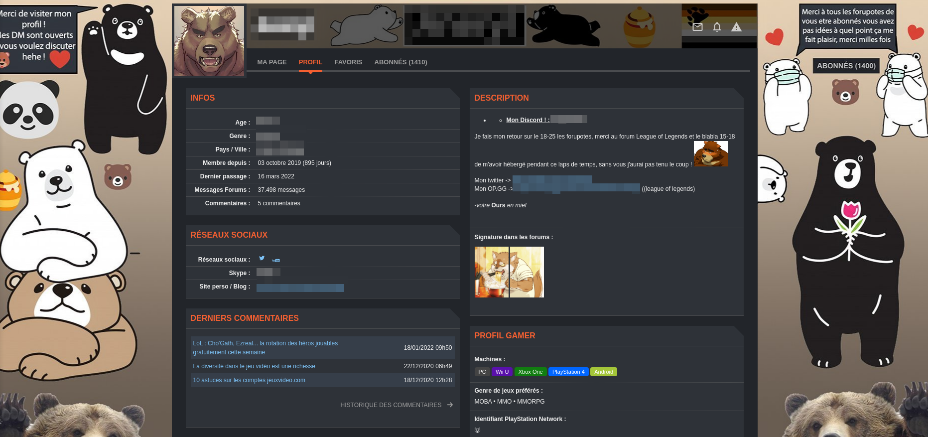 Pas difficile à reconnaitre (évitez de donner son pseudo pour pas que ça saute trop vite), mais faut qu'on en parle : - les ours - tout mignons dans l'image de fond, prédateur (sexuel ?) en PdP - les masques sur les nounours golems qui disent merci aux abonnés en mode sans eux il se serait déjà jeté d'un pont - le pot de sperme en guise de pot de miel - la diversité (dans le jv) est une richesse (mais ça fait 40 ans que personne n'a jamais su expliquer en quoi concrètement c'en était une) - possède toutes les consoles d'une génération et passe sa vie devant les MMO - le drapeau qui ressemble à une appartenance de genre, surement un truc glauque je veux même pas savoir - la signature affreuse qui le représente surement lui-même en train de s'exciter tout seul pendant que personne ne le regarde - "Visitez mon profil mes DM sont ouverts héhé" comme ça devant le juge je pourrai dire que c'est pas moi qui suis allé chercher les gosses mais l'inverse - "merci au 15-18" et il indique en avoir beaucoup plus - le sticker avec un ours qui fait une tête comme s'il venait de se faire gauler en train de se laisser tripoter par des gamins - compte chelou toujours debout 3 ans après sa création