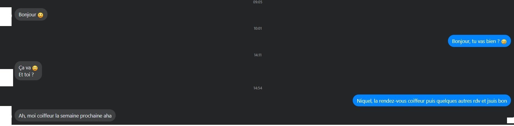 attends rien n'est sur, mais je lui ai répondu un truc du genre " Tu me montreras " ( pour sa nouvelle coupe )