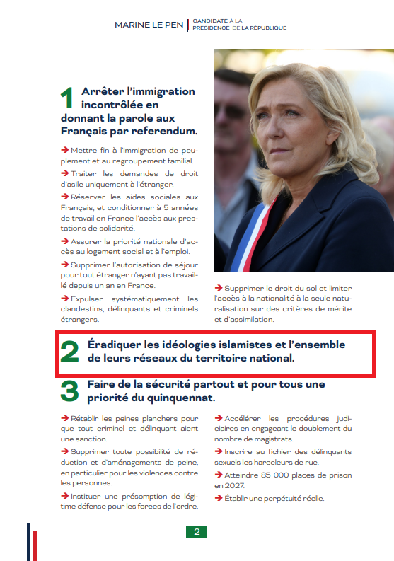 Marine a une proposition de loi détaillée déjà prête à voter.Z est un pion du système sponsorisé par Bolloré pour affaiblir Le Pen.